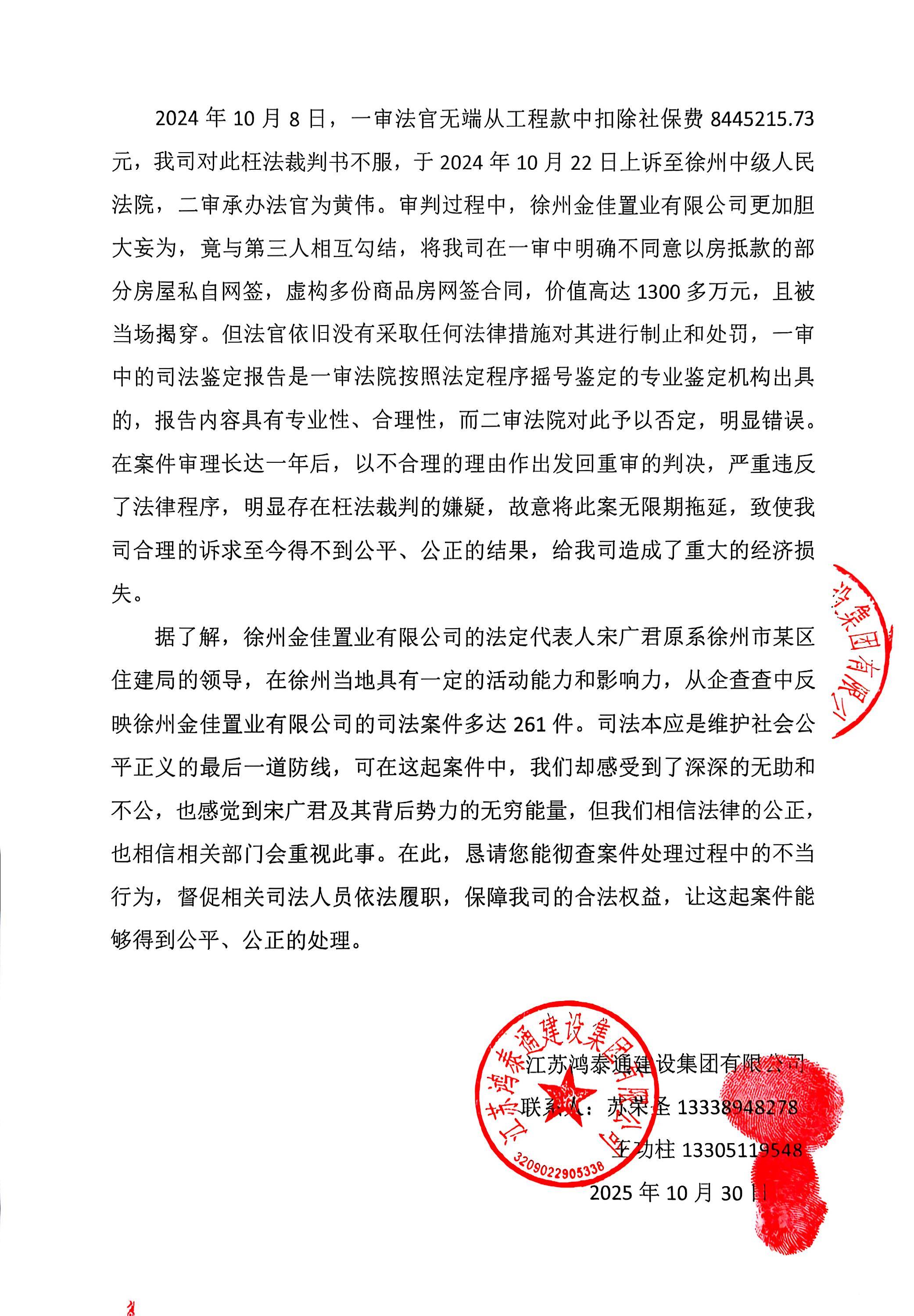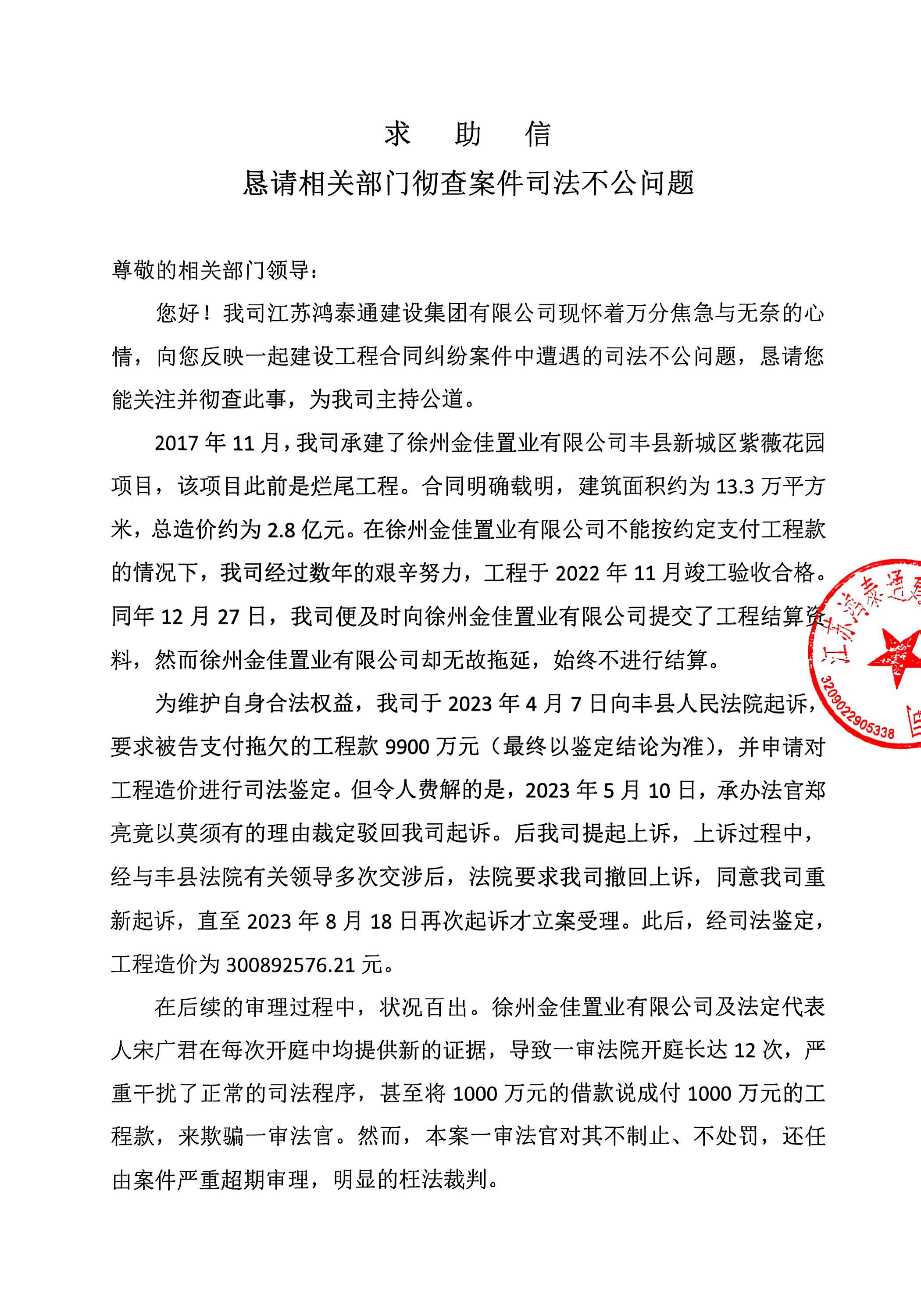 江苏鸿泰通建设集团有限公司致信相关部门,称在与徐州金佳置业建设工程合同纠纷中遭遇司法不公。2017 年 11 月鸿泰通承建丰县紫薇花园项目,完工后金佳置业拖延结算。