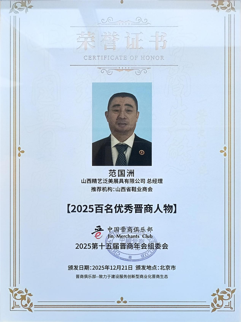 2025年12月20日至21日,以“科技聚生态 出海谋共赢”为主题的2025第十五届晋商年会在北京山西大厦成功举办 ,山西省鞋业商会执行会长范国洲喜获中国晋商俱乐部“2025百名优秀新晋商人物”荣誉。