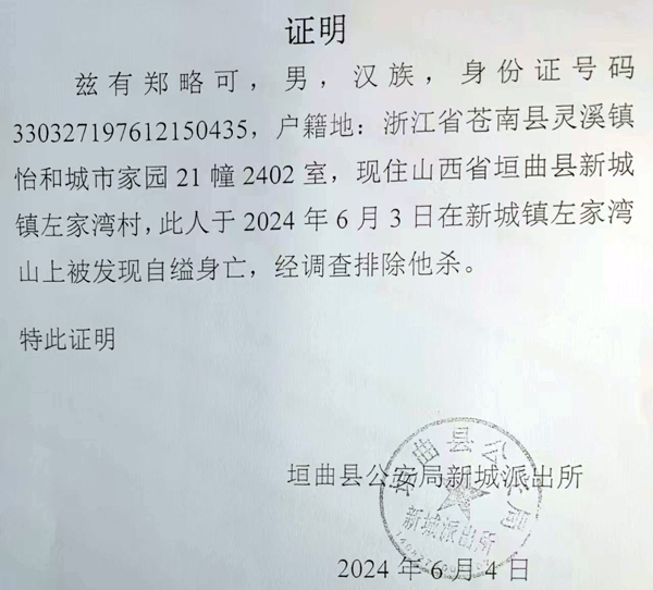2024年6月3日,郑略可死亡10天后,他的发小排除万难在矿区山里将其找到,发现吊死在树上。陈焕松当时在浙江苍南老家,无法赶回垣曲,不知详情,就委托中矿办理丧事,哪知未经尸检等法定程序第二天就将郑略可匆匆火化,家属处于极度悲痛中,根本无暇顾及流程。