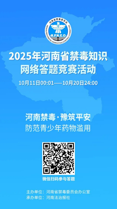 为全面贯彻落实党的二十大和二十届二中、三中全会精神,全面落实习近平总书记关于禁毒工作的重要指示精神,广泛动员全社会力量参与禁毒斗争,不断提高群众识毒防毒拒毒意识和能力,河南省禁毒委员会办公室决定以“河南禁毒·豫筑平安——防范青少年药物滥用”为主题,组织开展2025年河南省禁毒知识网络答题竞赛活动,望全社会积极参与,营造全民禁毒浓厚氛围。