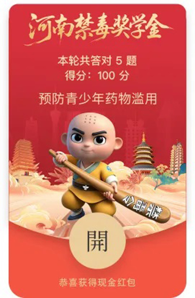 活动期间,每天设置1011份“禁毒奖学金”,以微信红包形式发放,其中63元1份、6.3元10份、0.63元1000份,参与答题全对者将有机会领取,领完为止。