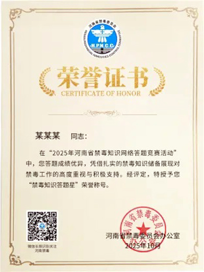累计答题5天以上且每天都有全对成绩的即可获得“禁毒知识答题星”电子荣誉证书一份。