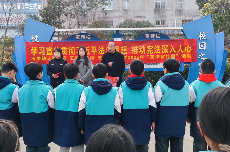 (桑兴鹏)在2025年全国“宪法宣传周”来临之际,为深入学习宣传贯彻习近平法治思想,推动宪法精神深入人心,五星镇中心学校以“学习宪法、尊崇宪法、践行宪法”为核心,创新推出“识、诵、学、普、绘、唱”六维联动活动,让抽象的法律条文转化为可感可触的校园实践,为全体师生献上了一场沉浸式法治文化盛宴。