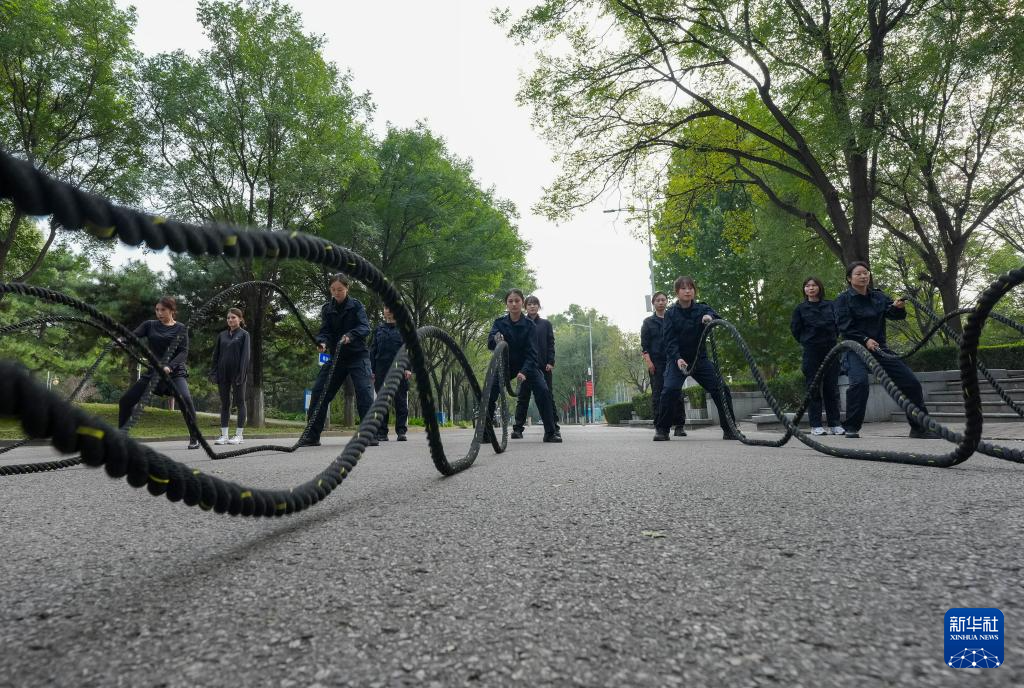10月23日,参训女刑警在进行“战绳”上肢力量训练。