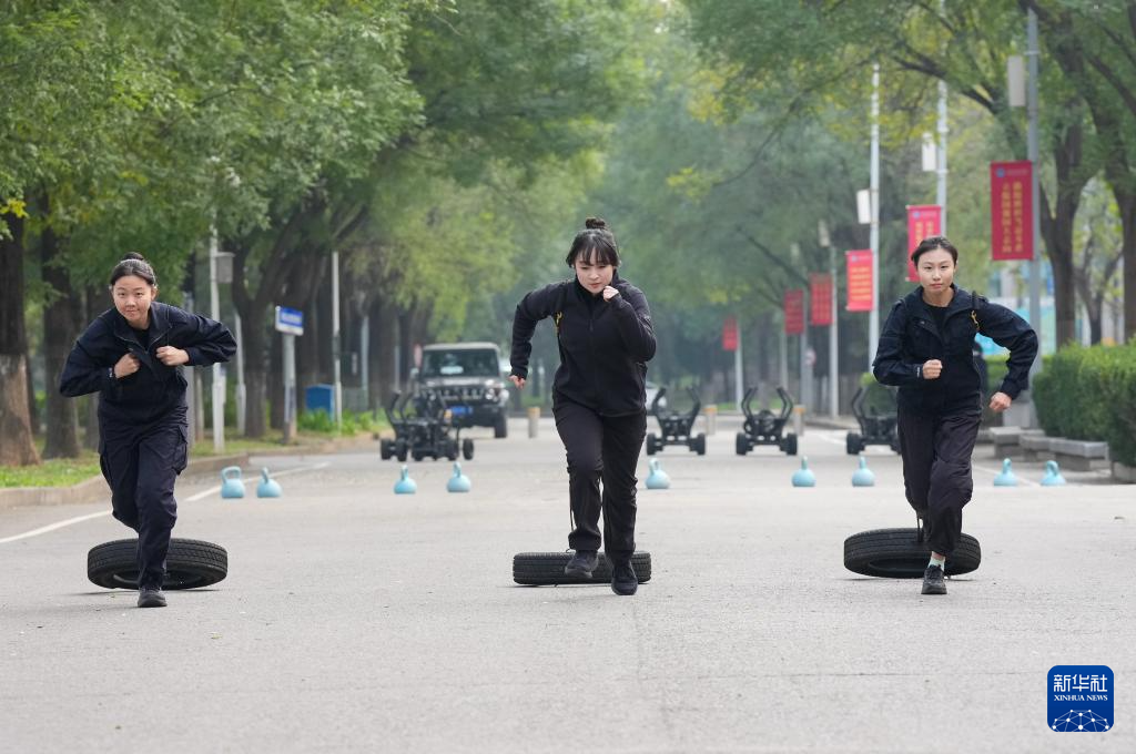 10月23日,参训女刑警在进行“负重坦克车推拉”训练。