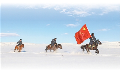 新疆出入境边防检查总站阿勒泰边境管理支队加郎阿什边境派出所民警开展巡边踏查。杨 帅摄(影像中国)