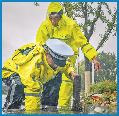 浙江省湖州市长兴县公安局民辅警冒着强降雨疏通排水口。方金华摄(影像中国)
