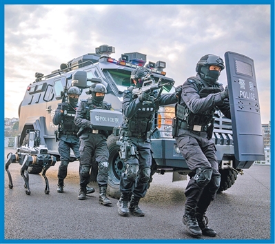 四川省绵阳市公安局特巡警支队特警大队队员与警用机器狗协同配合,开展实战化演练。唐 超摄(影像中国)