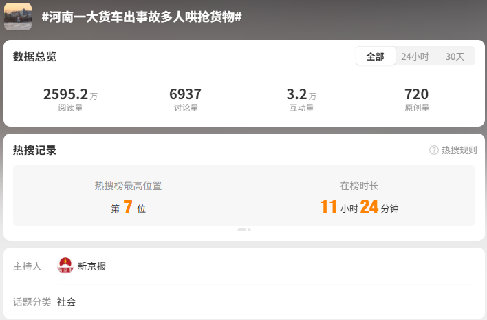 截至12月29日14时,全网相关信息1.2万余条,“#河南一大货车出事故多人哄抢货物#”“#警方介入货车出事故货物遭哄抢#”“#货车事故货物被哄抢司机嘶吼别抢了#” 等相关微博话题阅读量累计超3500万。