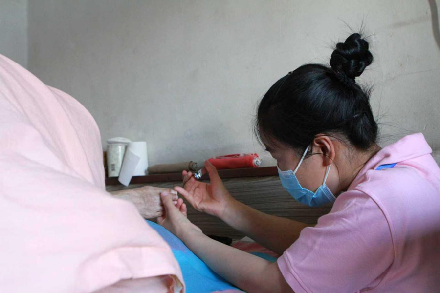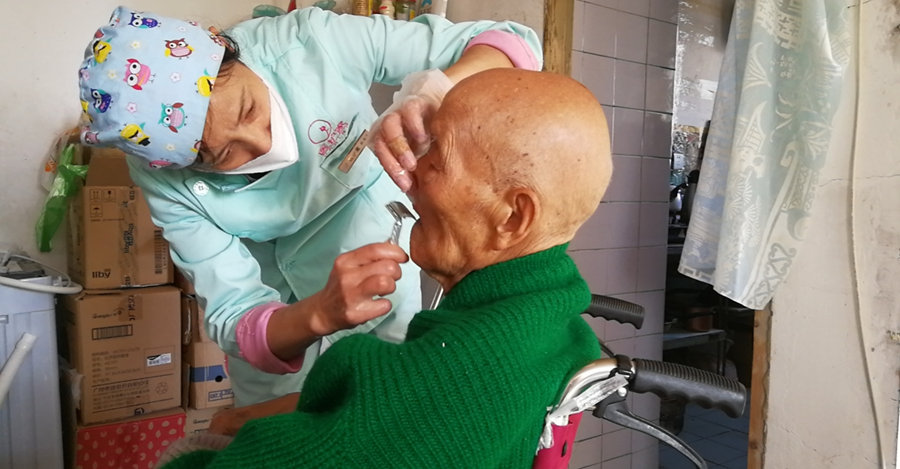 资料图片:长期照护师为重度失能老人提供长护险护理服务(北京市石景山区医保局供图)