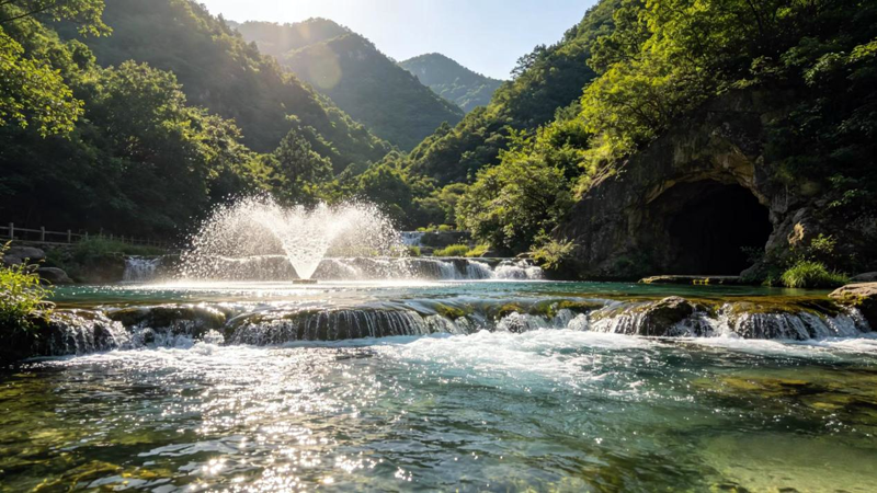水之灵,在山川之魂。大秦之水的核心水源,隐匿于泾阳县张家山筛珠洞泉群。这里依偎在九嵕山与北仲山的臂弯里,藏身于郑国渠世界遗产保护区的深处,恰好坐落在北纬32°-43°这一世界公认的黄金水源带上。群山如屏,隔绝了尘世的喧嚣,70余处自涌泉眼宛若大地的明眸,日日不息地喷薄出约4万吨清泉。这水,不走地表半步,而是潜入地下百米,在矿层的缝隙间历经千万年的层层渗透与淘洗,最终凝萃成这滴不含杂质的天然活水。