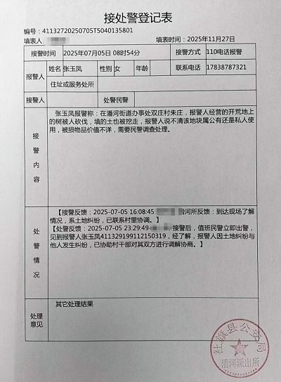 张玉凤说:“2025年6月份,王奎中又在我家开荒地上(他新建房东侧临长安路)乱栽树并私自砍伐我家树木。2025年7月5日,王奎中私自砍伐我家树木,我打110报警,潘河派出所出警,派出所反馈是:到达现场了解情况,系土地纠纷,已联系村里协调。”