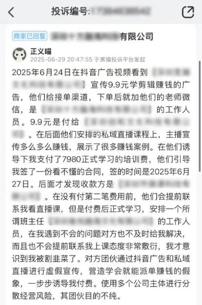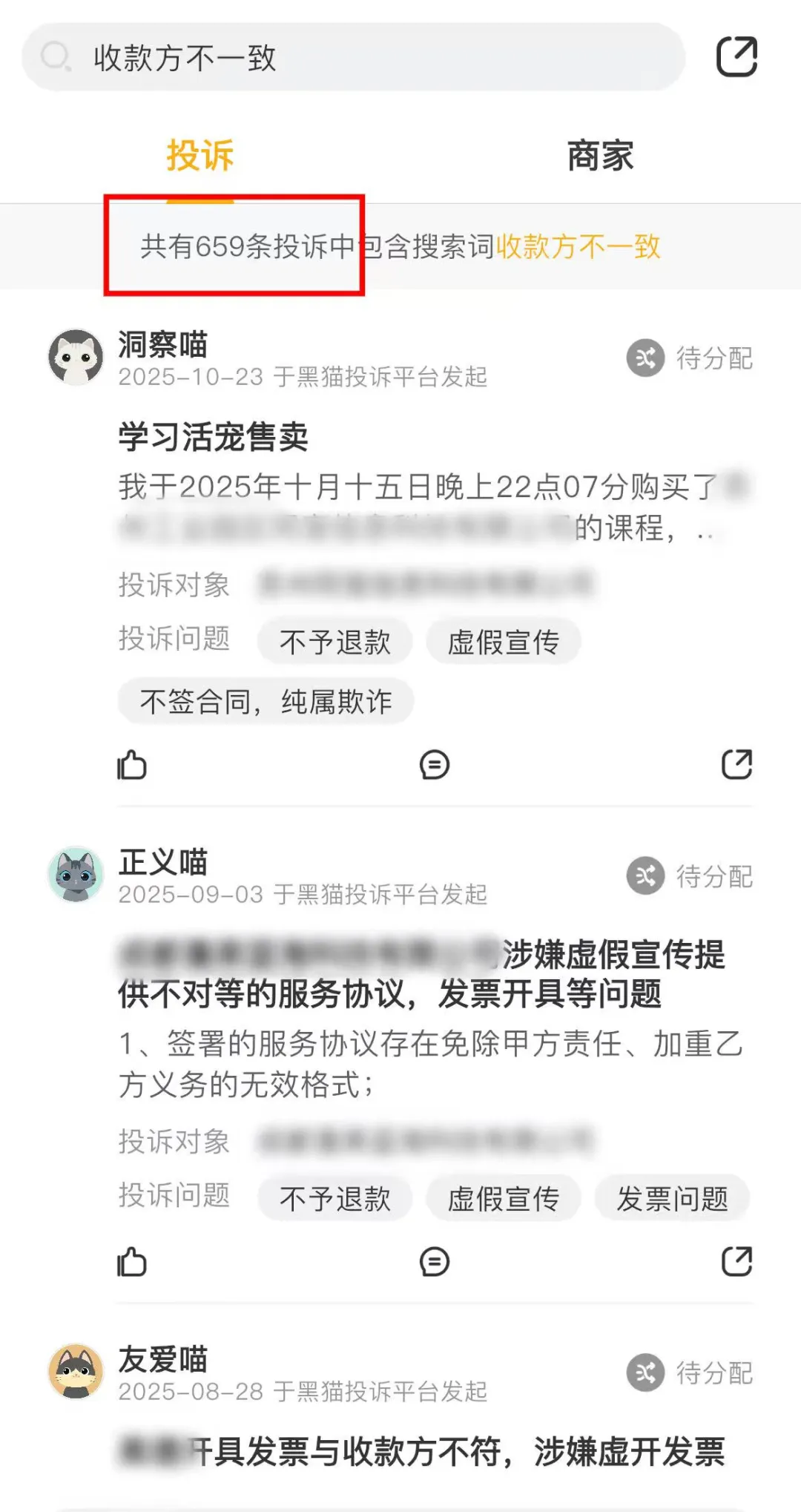 另一位消费者则表示,之前看到某知识付费商家宣传“快速盈利”“100%接单”“终身推荐就业”承诺,没想到付款后竟发现收款主体是陌生企业而非某知名大平台;从广告推广运营、前期对接到9.9元体验课引流以及正式培训费收款方,再到后期服务的班主任,整个过程竟涉及五家不同公司主体……