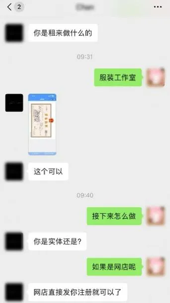 法治网记者以需要注册服装类网店为由添加卖家微信后,对方在了解用途后,随即发来相关贸易类公司的营业执照,并直言租用后可直接用于网店注册,全程未对租用方的情况进行了解。