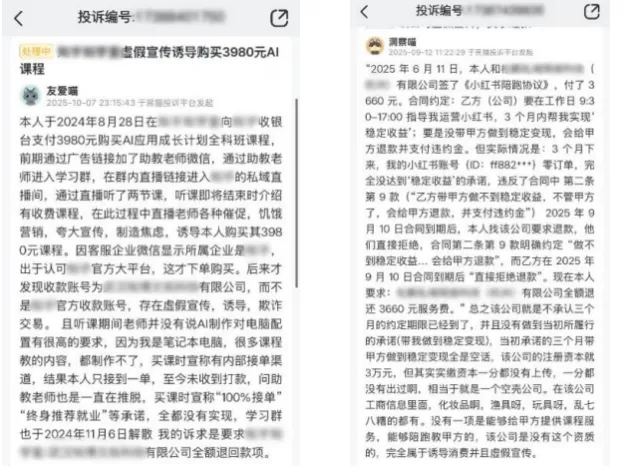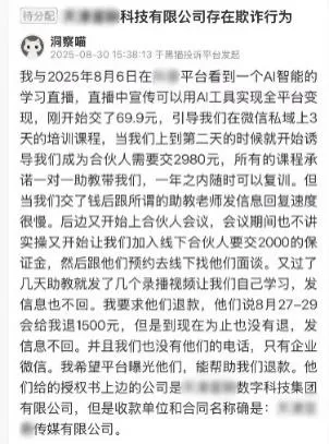 一位消费者投诉称,在某平台看到“AI智能变现”直播,先被收取69.9元入门费,随后在微信私域中被诱导缴纳2980元成为“合伙人”,之后又被要求交2000元保证金参加线下会议。结果课程内容仅为几个录播视频,助教随后失联,承诺的退款也迟迟未到账。