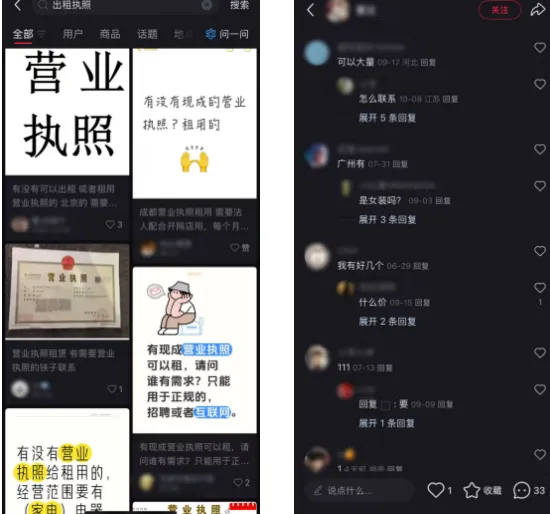 法治网记者在某社交平台以“出租执照”为关键词进行检索,瞬间便出现大量相关信息。此类帖子大多以“闲置营业执照出租”为引流点,评论区中咨询租赁细节、问价的用户不在少数。