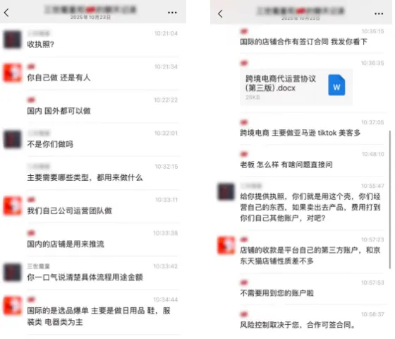 随后,对方发来一份合同,在其中约定,营业执照被用来为该商户的客户注册电商店铺使用。出租方同时还需要提供身份证等信息,并配合该商户进行注册等操作。