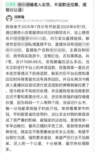 法治网记者注意到,在黑猫投诉平台上,直播电商注册主体和实际运营团队、收款单位不一致现象尤为突出,有多达600余条相关投诉。其中,有消费者反映,一些商家在出售产品后即销声匿迹;还有的商家注册主体、签约主体和收款单位各不相同,交易涉及多家关联公司。这种“分身术”式的运营模式,导致消费者在寻求售后时常常被“踢皮球”,甚至压根找不到售后,最终面临被拉黑、维权无门的困境。