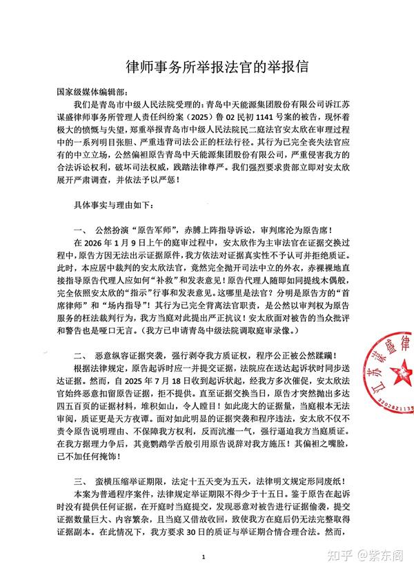 2025年岁末,在“青岛中天能源集团股份有限公司诉江苏谋盛律师事务所管理人责任纠纷案(2025)鲁02民初1141号案”的庭审当日,原告无法出示证据原件。按照法律规定,这种情况下,被告有权拒绝质证。本该保持中立的青岛市中级人民法院民二庭法官安某欣,竟然当众脱下“裁判服”,手把手教原告代理人怎么补救、怎么说话 !原告就像提线木偶,法官指哪打哪。请问本应代表正义的安法官:您到底是法官,还是原告派来的“首席律师”?