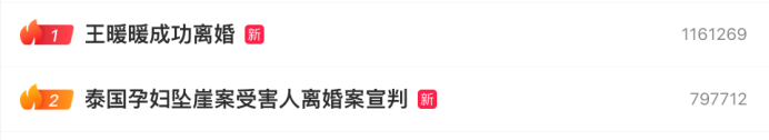截至10月12日20时,全网信息总量12万余条,“#王暖暖获离婚赔偿50万#”“#泰国孕妇坠崖案受害人离婚案宣判#”“#王暖暖成功离婚#”等全平台相关话题阅读量累计14.6亿次。