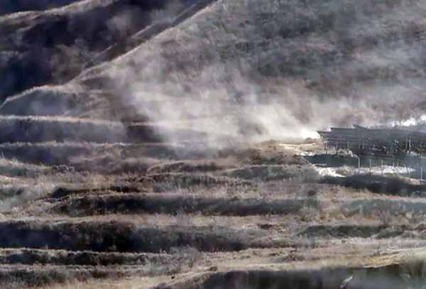 烟筒山上,大型挖掘机肆意挖掘,装载机快速装渣,翻斗车排成长龙。植被被破坏、山体千疮百孔,树木被拔、尘土飞扬,周边乌烟瘴气,生态惨遭破坏。